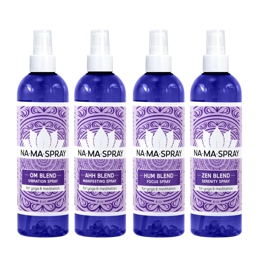 4- 8 Ounce Bottles: Ahh Blend For Manifesting. Helps To Achieve Successful Manifesting. Hum Blend For Focus. Supports Focus And Clarity Of Thought. Om Blend For Vibration. Assists In Elevating Your Emotional And Spiritual Vibration. Zen Blend For Serenity. Promotes Calm And Tranquility For Ultimate Serenity. With Continued Use Of Namaspray During Yoga And Meditation Rituals, Your Brain Will Come To Associate The Scent With The Centered, Open State You Experience During Practice. Later, Even When You'Re Not Doing Yoga Or Meditation, Misting Your Personal Space Will Help Bring About This State Through A Process Called Neuro-Associative Conditioning And You Can Experience This "Connected" State Any Time. Namasprays Pure Essential Oils Were Chosen To Work Together Synergistically To Enhance Your Yoga And Mediation Practice. Namaspray Is Made In The U.S. With Only The Highest Quality Natural Ingredients. Our Sprays Are Gluten-Free And Vegan, And Like All Moonwater Elixirs Products, 100% Cruelty Free. Containing Distilled Water And Delightfully Effective Organic Essential Oil Blends, Hand-Picked Clear Quartz Crystal And The Magical Wonders Of Reiki, Our Yoga Mat And Personal Space Mists Will Motivate Your Body And Encourage Deep Breathing To Enhance Your Yoga And Meditation Practice. Handcrafted In The United States Of America. Moonwater Elixirs Is Proud To Produce All Our Personal Sprays In The United States Of America. Four Unique 8 Ounce Blends: Distilled Water (Not Chlorinated City Tap Water). Organic Essential Oils. Handpicked Clear Quartz Crystals In Every Bottle. Plus Every Bottle Is Treated With Reiki For Maximum Holistic Benefits. Namaspray Is Created To Deliver Unique Attributes And Promote Openness And Clarity For The Mind. Our Four Pleasing Scents Have Great Benefits To The Support Clear, Smooth Breathing Too. No Synthetic Colors Or Fragrances. Namaspray: 4 Unique Blends With 4 Unique Purposes. Spray Around Any Room To Start The Morning With A Positive Attitude And With The Physical And Mental Benefits Of Yoga. You Can Also Use It Before Or After Meditation By Misting Your Personal Space Or Yoga Mat. Calming & Soothing Effects: It Calms The Body, Mind, Spirit And Boosts Self-Esteem. Our Blend Of Oils Will Help To Create Inner Peace, Relieve Anxiety And Stress As Well. Namaspray Will Help To Unwind And Uplift Your Attitude With A Peaceful And Soothing Effect After A Stressful Day. Yoga & Meditation Blends: Experience The Invigorating Aroma Of Namaspray In Your Yoga Space Or Meditation Area With Our Unique Blend Of Essential Oils. The Calming Aromatherapy Smell Will Soothe Exhaustion And Create Refreshing And Invigorating Effect In Your Personal Space. Mist Around Your Home And In Your Car For A Mood-Enhancing, Feel-Good Space. Motivating And Aromatic: Reconnect With Your Practice. Find Your Balance. Easy To Use, No Mess. Convenient 4 Ounce Spray Bottle To Carry Anywhere. Made In The Usa. 100% Money-Back Guarantee. Cruelty-Free.